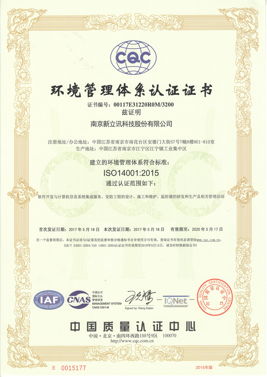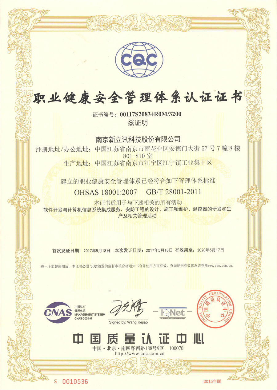 2017年5月,新立訊經(jīng)中國(guó)權(quán)威認(rèn)證機(jī)構(gòu)CQC(中國(guó)質(zhì)量認(rèn)證中心)全面、嚴(yán)格的評(píng)定與審核,正式通過ISO9001國(guó)際質(zhì)量管理體系認(rèn)證、ISO14001國(guó)際環(huán)境管理體系認(rèn)證、OHSAS18001職業(yè)健康安全管理體系認(rèn)證三大國(guó)際管理體系認(rèn)證,并獲得相關(guān)證書。證書涵蓋范圍包括軟件開發(fā)與計(jì)算機(jī)信息系統(tǒng)集成服務(wù),安防工程的設(shè)計(jì)、施工和維護(hù),溫控器的研發(fā)和生產(chǎn)及相關(guān)管理活動(dòng)。這意味著新立訊成為CNAS(中國(guó)合格評(píng)定國(guó)家認(rèn)可委員會(huì))、IQNet(國(guó)際認(rèn)證聯(lián)盟)和IAF(國(guó)際認(rèn)可論壇)三方共同認(rèn)可的綜合數(shù)據(jù)應(yīng)用服務(wù)商,更標(biāo)志著新立訊的質(zhì)量管理、環(huán)境管理、健康安全管理等已達(dá)到國(guó)際先進(jìn)水平。同時(shí)此三項(xiàng)證書的取得是對(duì)新立訊企業(yè)管理理念和質(zhì)量管理水平的充分肯定,也為企業(yè)向社會(huì)提供優(yōu)質(zhì)的產(chǎn)品和服務(wù)提供了強(qiáng)有力的保障。