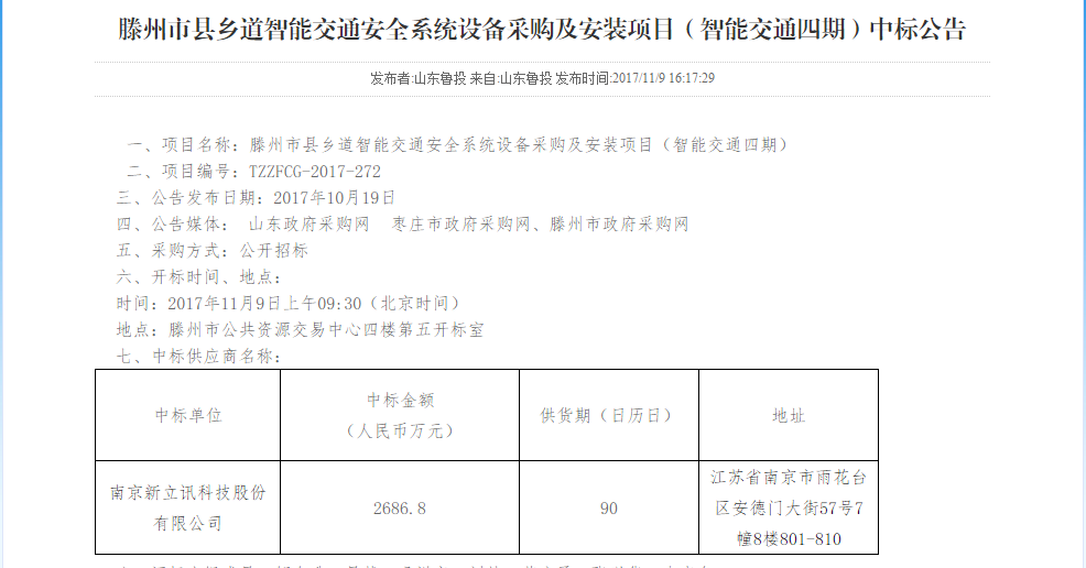 2017年11月9日,經(jīng)山東滕州市公安局交通警察大隊(duì)公開招投標(biāo),新立訊山東辦事處以優(yōu)秀的技術(shù)解決方案、完善的售后服務(wù)體系等,贏得了評(píng)標(biāo)專家和招標(biāo)方的肯定,成功中標(biāo)山東滕州市縣鄉(xiāng)道智能交通安全系統(tǒng)設(shè)備采購(gòu)及安裝項(xiàng)目(以下簡(jiǎn)稱“滕州市智能交通四期項(xiàng)目”)(招標(biāo)項(xiàng)目編號(hào):TZZFCG-2017-272),中標(biāo)金額為人民幣2686.8萬(wàn)元。